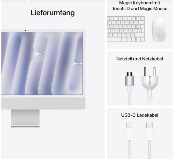 Enthaltene Komponenten Maus, Netzkabel und Netzteil, Tastatur, USB-C-Ladekabel, iMac